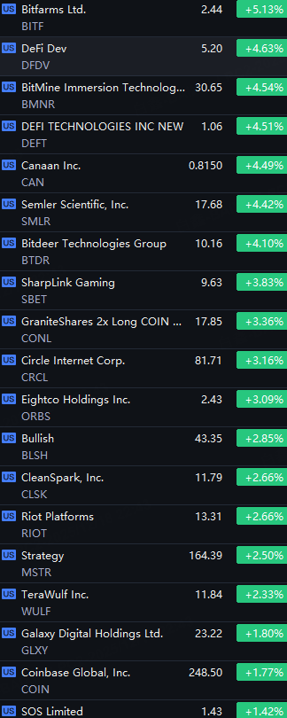 Crypto Shares Rally. Hut 8 Up 11%; Applied Digital, BTCS, ALT5 Up 8%; Robinhood Up 6%; Circle and Strategy Up 3%.