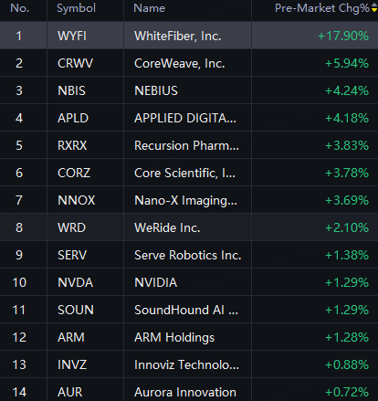 Nvidia-Linked Shares Shined. WhiteFiber up 18%; CoreWeave up 6%; Nebius and APLD up 4%; Recursion, Core Scientific and Nano-X up 3%.