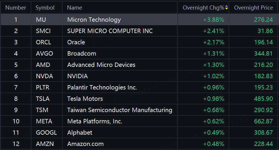 Big tech stocks jumped in overnight trading. Micron up nearly 4%; SMCI, Oracle up over 2%; Broadcom, AMD, Nvidia up over 1%.