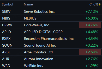 Serve Robotics up 7%; Nebius, CoreWeave up 5%; RXRX, APLD up 4%; SoundHound AI, Aurora Innovation, Arbe Robotics up 3%.