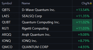 D-Wave Quantum up 14%; QUBT, SEALSQ, Rigetti Computing rose 11%; IONQ, ARQQ up 9%; QMCO up 5%.