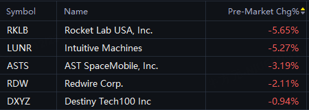 Space stocks fell in premarket trading on Tuesday. Rocket Lab fell 6%; Intuitive Machines fell 5%; AST SpaceMobile fell 3%; Redwire fell 2%; DXYZ fell 1%.