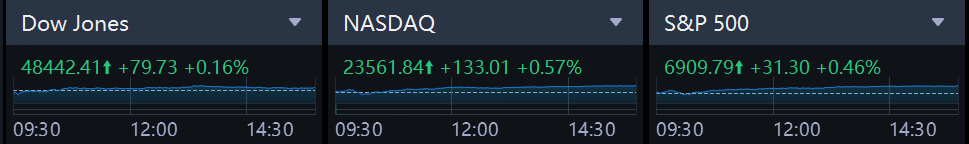 The U.S. major indexes closed as follows: the Dow Jones up 0.16% at $48,442.41, the S&P 500 up 0.46% at $6,909.79, and the Nasdaq Composite up 0.57% at $23,561.84.
