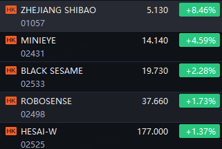 Hong Kong intelligent driving concept stocks performed actively, with Zhejiang Shibao up over 8%, MINIEYE up over 4%, BLACK SESAME up over 2%, and HESAI-W and ROBOSENSE both up 1%.