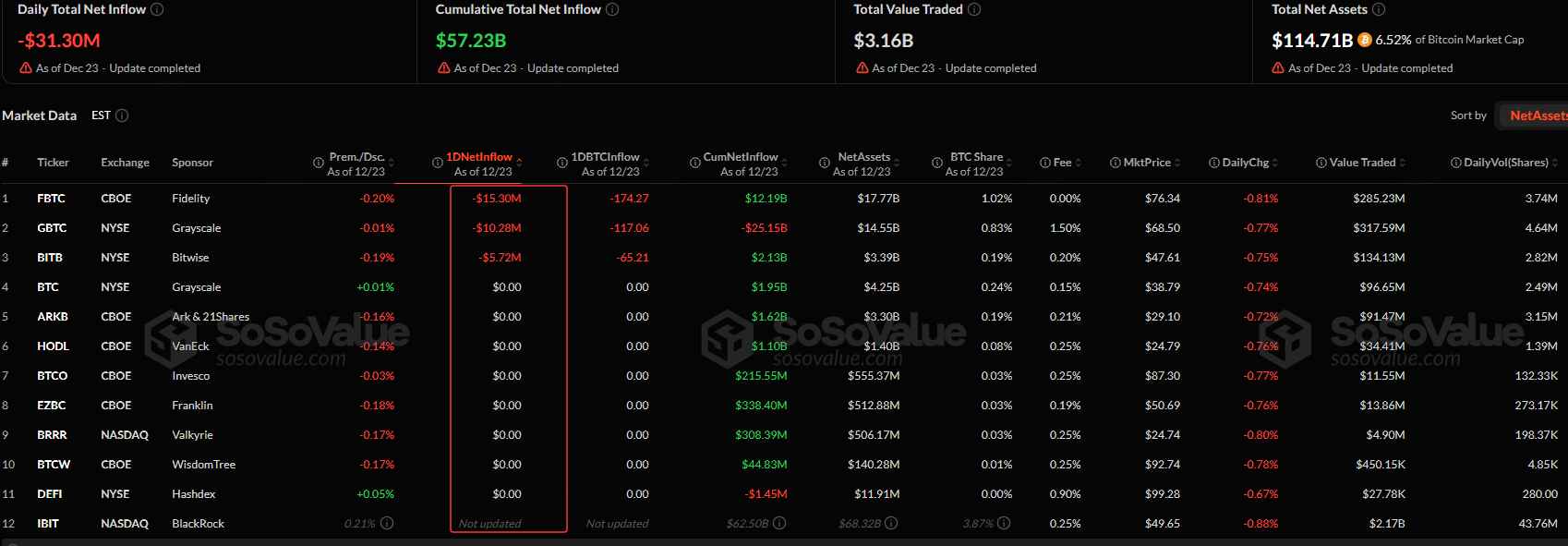 The Bitcoin spot ETF with the highest net outflow on Dec. 23 was Fidelity Wise Origin Bitcoin Fund, with a net outflow of $15.3 million.