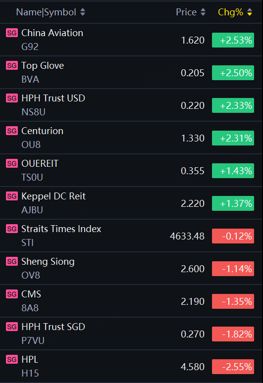 Singapore shares closed lower on Wednesday. STI down 0.12%; China Aviation, Top Glove, HPH Trust, Centurion up over 2%; Sheng Siong, CMS down over 1%.