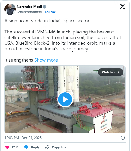 The BlueBird 6 satellite was launched at 8:55 a.m. local time from the Satish Dhawan Space Center in southern India atop an LVM3 rocket from the Indian Space Research Organization (ISRO). It reached low-Earth orbit approximately 16 minutes into the flight, as streamed live on YouTube.