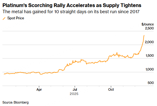 Platinum also soared on Wednesday, jumping 4% to advance beyond $2,300 an ounce for the first time since Bloomberg began compiling data in 1987. Buoyed by tight supplies and historically elevated borrowing costs, the metal — used in the automotive and jewelry sectors — rose for a 10th straight session, its longest winning streak since 2017.