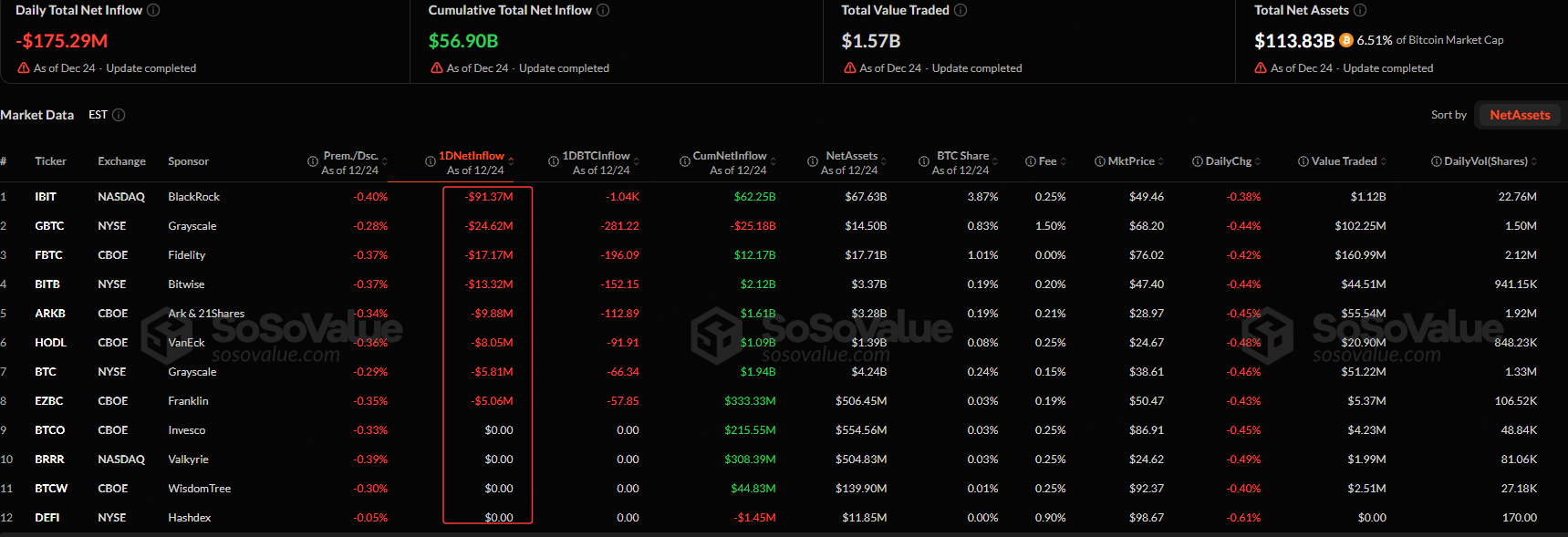 The Bitcoin spot ETF with the highest net outflow on Dec. 24 was iShares Bitcoin Trust , with a net outflow of $91.37 million.