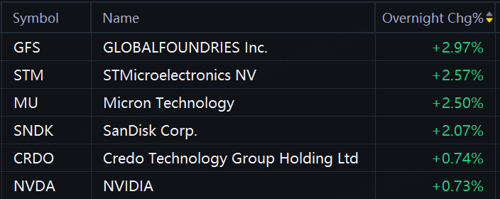 Some chip stocks gained in overnight trading. GlobalFoundries, STMicroelectronics, and Micron rose 3%; SanDisk rose 2%; Nvidia rose 0.7%.