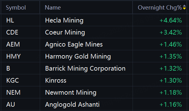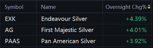 Gold and silver stocks jumped in overnight trading as spot gold refreshed new high to $4,531, spot silver topped $75. Hecla Mining rose 5%; Coeur Mining rose 3%; whie Endeavour Silver, First Majestic Silver, and Pan American Silver rose 4%.