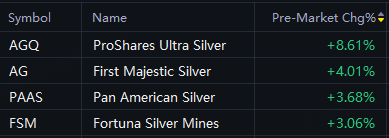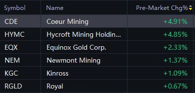 AGQ up 9%; Coeur Mining, Hycroft Mining up 5%; First Majestic Silver, Pan American Silver up 4%; Equinox Gold rose 2%; Newmont rose 1%.