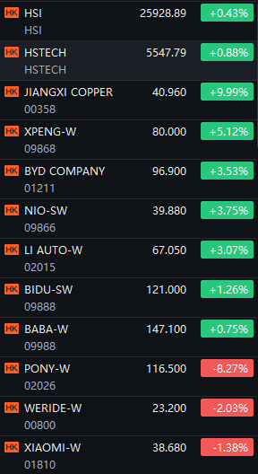 Jiangxi Copper up 10%; Xpeng up 5%; BYD Company, Nio and Li Auto up 3%; Pony down 8%; WeRide down 2%.