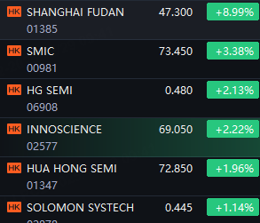 HK Chip Stocks Rally. Shanghai Fudan Up 9%; SMIC Up 3%; Hua Hong Semi, Innoscience And HG Semi Up 2%.