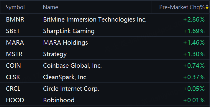 Crypto stocks gained in premarket trading. BitMine rose 3%; SharpLink Gamingand MARA Holdings rose 2%; Strategy rose 1%; Coinbase rose 0.7%.