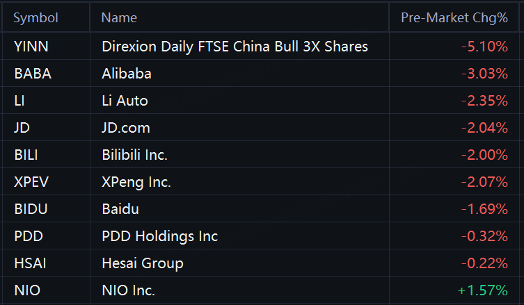 Chinese ADRs dipped in premarket trading as transactions slowed down and a government report showed that Chinese industrial companies posted a bigger profit decline. Direxion Daily FTSE China Bull 3X Shares fell 5%; Alibaba fell 3%; Li Auto, JD.com, Bilibili, XPeng, and Baidu fell 2%; while NIO rose 2%.