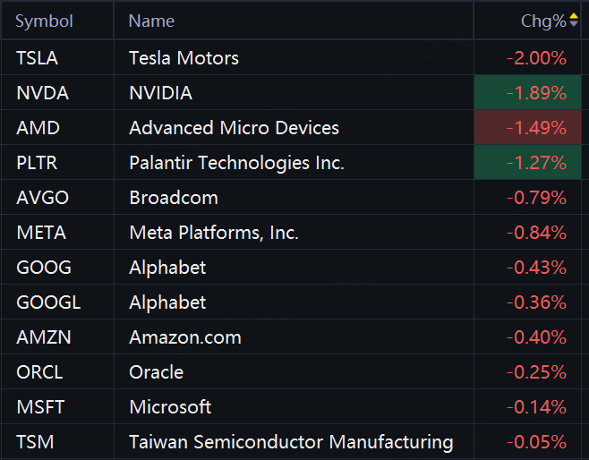 Big tech stocks dropped in morning trading. Tesla, Nvidia, and AMD fell 2%; Palantir fell 1%; Meta and Broadcom fell 0.8%.