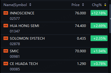 Innoscience rose 12%; Hua Hong Semi up 3%; SMIC, Solomon Systech up 2%; CE Huada Tech up 1%.