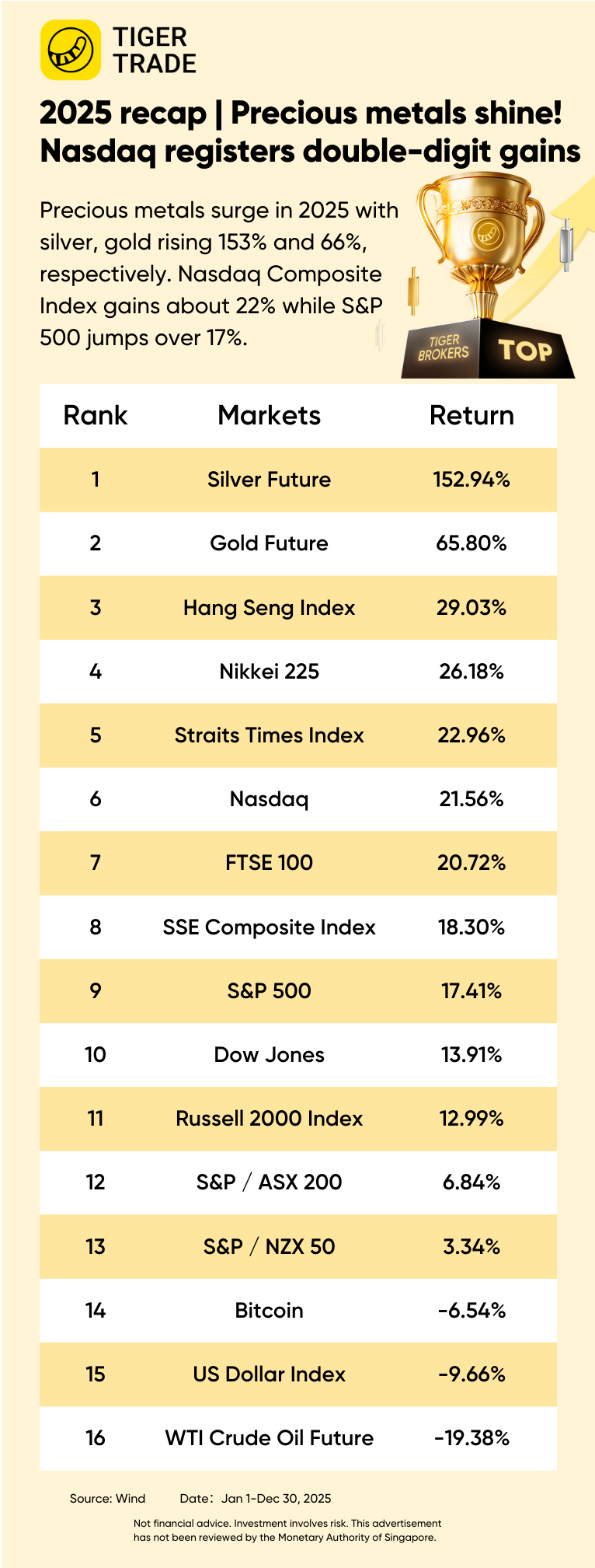 Precious metals surged in 2025 with silver, gold rising 153% and 66%, respectively. Nasdaq Composite Index gained about 22% while S&P 500 jumped over 17%.