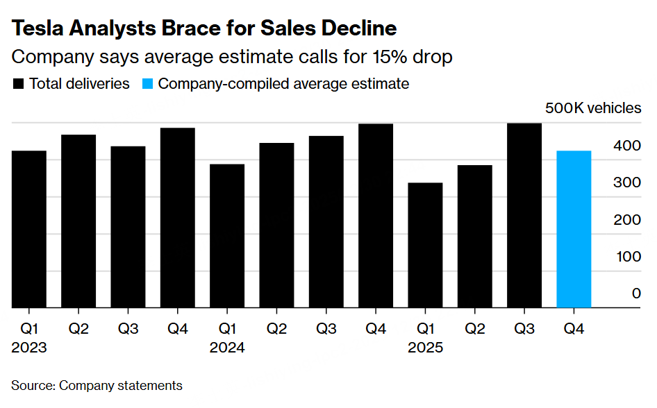 By Tesla’s count, analysts on average expect the company to deliver 422,850 cars in the fourth quarter, down 15% from a year earlier. That compares with a Bloomberg-compiled average of 445,061 vehicles, a 10% drop.