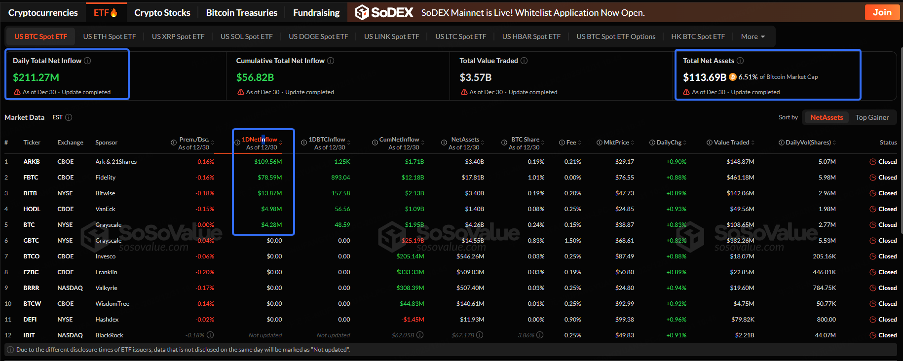 The Bitcoin spot ETF with the highest net inflow on Dec. 30 was ARK 21Shares Bitcoin ETF, with a net inflow of $109.56 million. Followed by Fidelity Wise Origin Bitcoin Fund, with a net inflow of 78.59 million, according to SoSoValue.