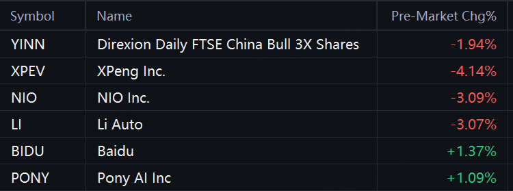 Chinese ADRs mixed in premarket trading. Direxion Daily FTSE China Bull 3X Shares fell 2%; XPeng fell 4%; NIO and Li Auto fell 3%; while Baidu and Pony AI rose 1%.