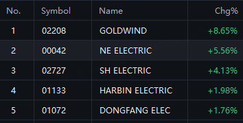 HK electric power stocks gained. Goldwind up 9%; NE Electric up 6%; SH Electric up 4%; Harbin Electric and DongFang Elec up 2%.