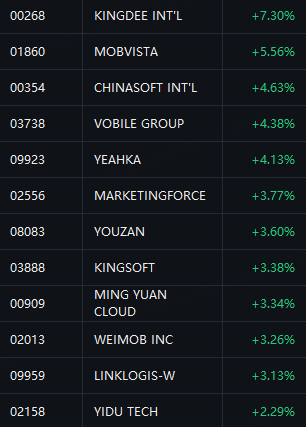 HK SaaS related stocks jumped. Kingdee up 7%; Mobvista up 6%; ChinaSoft, Vobile and Yeahka up 4%; MarketingForce, Youzan, Kingsoft and Weimob up 3%.