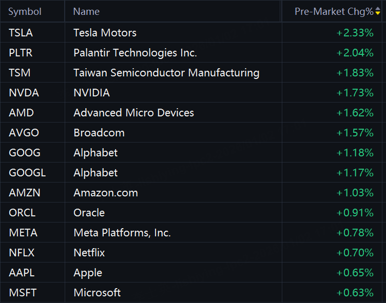 Big tech stocks gained in premarket trading. Tesla, Palantir, TSMC, Nvidia, AMD, and Broadcom rose 2%; Alphabet and Amazon rose 1%.