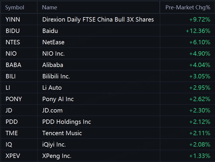 In terms of other companies and ETFs, Direxion Daily FTSE China Bull 3X Shares rose 10%; NetEase rose 6%; NIO rose 5%; Alibaba rose 4%; Bilibili, Li Auto, and Pony AI rose 3%; JD.com, PDD Holdings, Tencent Music, and iQiyi rose 2%; XPeng rose 1%.