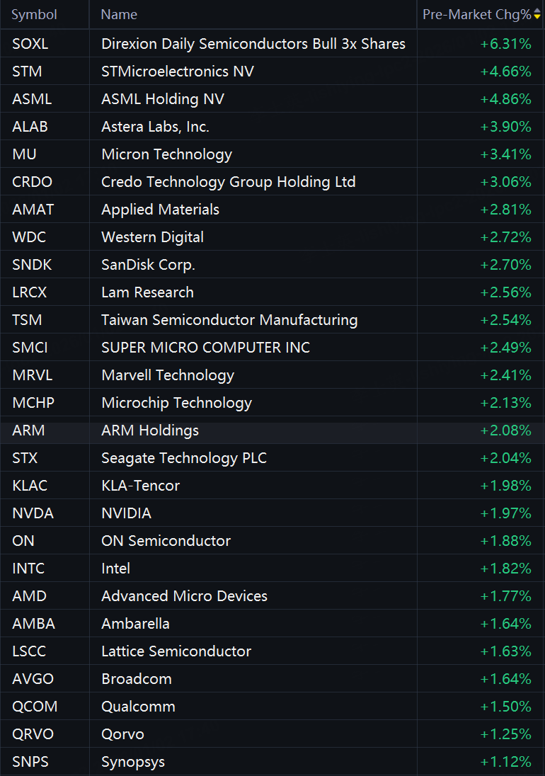 Semiconductor stocks jumped in premarket trading. Direxion Daily Semiconductors Bull 3x Shares rose 6%; STMicroelectronics and ASML rose 5%; Astera Labs rose 4%; Micron, Credo, Western Digital, SanDisk and TSMC rose 3%; Super Micro Computer, Marvell Technology, Arms, Seagate, Nvidia, Intel and AMD rose 2%.