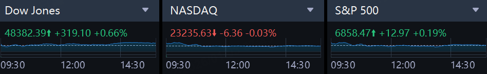 The Dow Jones Industrial Average .DJI rose 319.10 points, or 0.66%, to 48,382.39, the S&P 500 .SPX gained 12.97 points, or 0.19%, to 6,858.47 and the Nasdaq Composite .IXIC lost 6.36 points, or 0.03%, to 23,235.63.