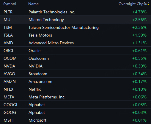 Palantir up 5%; Micron up 3%; TSMC, Tesla up 2%; AMD, Oracle up 1%; Nvidia up 0.4%.