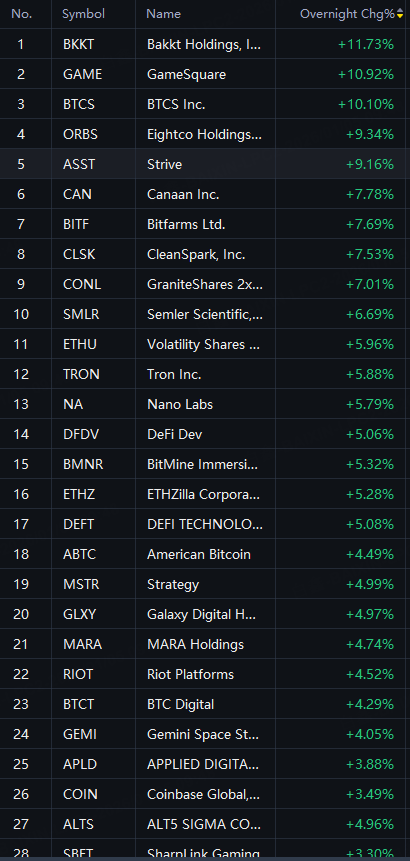 Crypto stocks gain in overnight trading. Bakkt up 12%; GameSquare and BTCS up 10%; Eightco and Strive rose 9%; Canaan, Bitfarms and CleanSpark rose 7%; BitMine and Strategy rose 5%; MARA and RIOT up 4%.