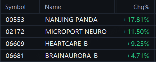 Brain-computer interface firms jumped in morning trading. Nanjing Panda rose 18%; MicroPort Neuro rose 12%; HeartCare Medical rose 9%; BrainAurora Medical rose 5%.