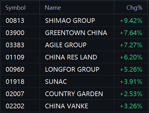 Chinese property shares jumped in morning trading. Shimao Group rose 9%; Greentown China rose 8%; Agile Group rose 7%; China Resources Land rose 6%; Longfor Group rose 5%; Sunac China rose 4%; China Vanke and Country Garden rose 3%.