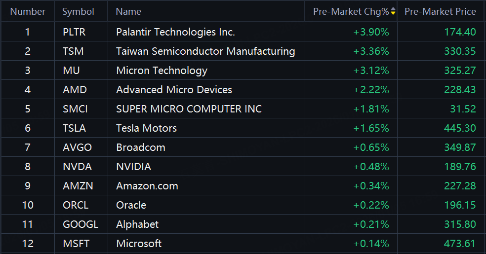 Palantir up 4%; TSMC, Micron up over 3%; AMD, SMCI up about 2%; Tesla up 1.6%.