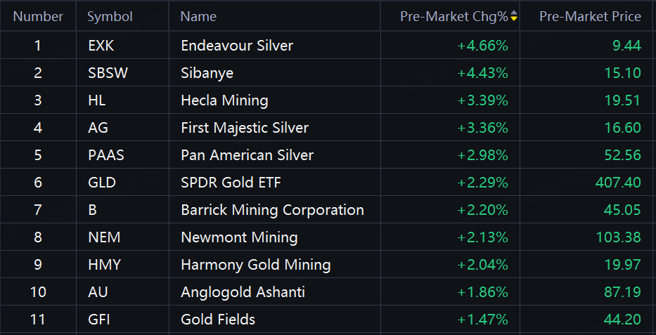 Endeavour Silver, Sibanye up over 4%; Hecla Mining, First Majestic Silver, Pan American Silver up around 3%; SPDR Gold ETF, Barrick Mining, Newmont Mining, Harmony Gold up over 2%.