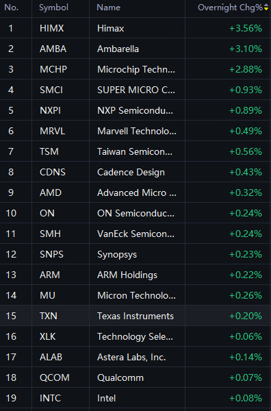 Chip Stocks kept rally in overnight trading. Himax, Microchip and Ambarella up 3%; SMCI and NXP up 1%.