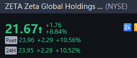 Zeta Global Holdings Corp. jumped 11% in overnight trading after climbing 9% on Monday trading. Zeta announced that it will utilize OpenAI models to support Athena, Zeta's artificial intelligence (AI) agent, which integrates with its Zeta Marketing Platform. This integration provides marketing professionals with voice-activated answers and an adaptive interface.