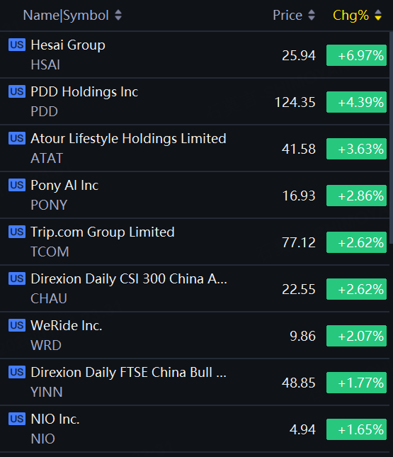 Chinese ADRs and ETFs rose on Tuesday. Hesai Group up 7%; PDD Holdings up over 4%; Atour, Pony AI up about 3%; Trip.com, CHAU, WeRide up over 2%.