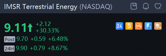 Terrestrial Energy shares jumped another 8.7% in overnight trading. The company surged more than 30% on Tuesday after the company announced it had executed an agreement with the U.S. Department of Energy for Project TETRA, a pilot reactor initiative using its Integral Molten Salt Reactor technology.