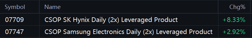Strong momentum in the memory sector continued, with CSOP SK Hynix Daily (2x) Leveraged Product surging more than 8% at the open and bringing its year-to-date gain to over 30%; the CSOP Samsung Electronics Daily (2x) Leveraged Product rose about 3%.