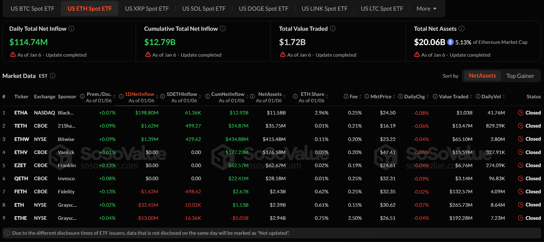 The Ethereum spot ETF with the highest net inflow on January 6 was iShares Ethereum Trust ETF (ETHA), with a net inflow of $198.80 million, according to SoSoValue.