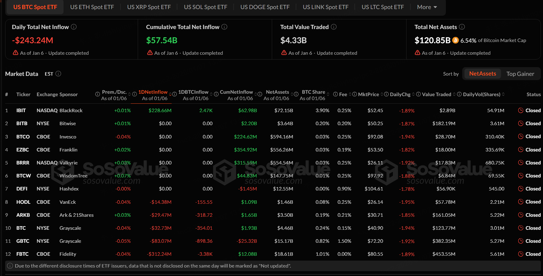 The overall net outflow of the US Bitcoin spot ETF on Tuesday was $243.24 million. The total net asset value of Bitcoin spot ETFs is $120.85 billion, and the ETF net asset ratio (market value compared to total Bitcoin market value) is 6.54%.