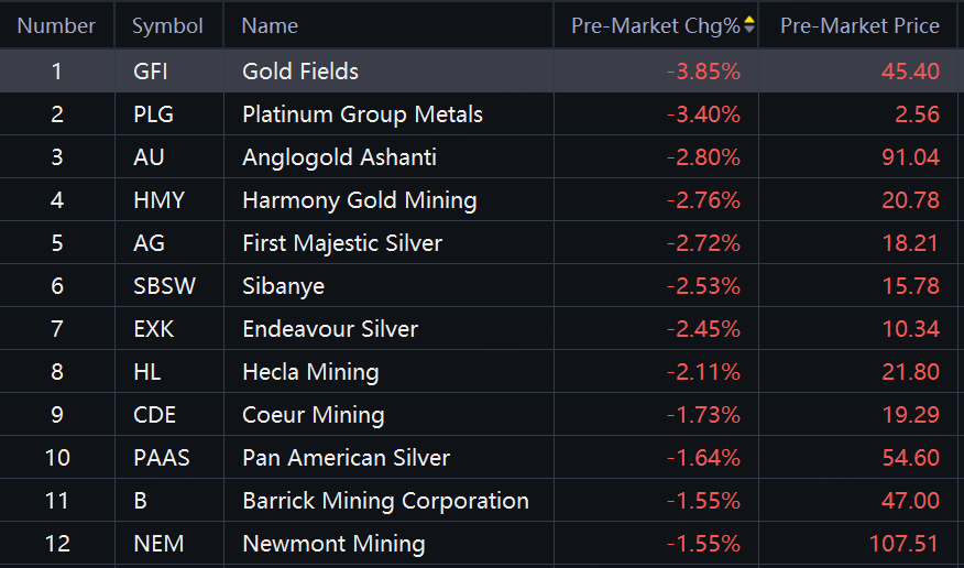 Precious Metals shares slid in premarket trading. Gold Fields down nearly 4%; Platinum Group, Anglogold, Harmony Gold, First Majestic Silver down about 3%.