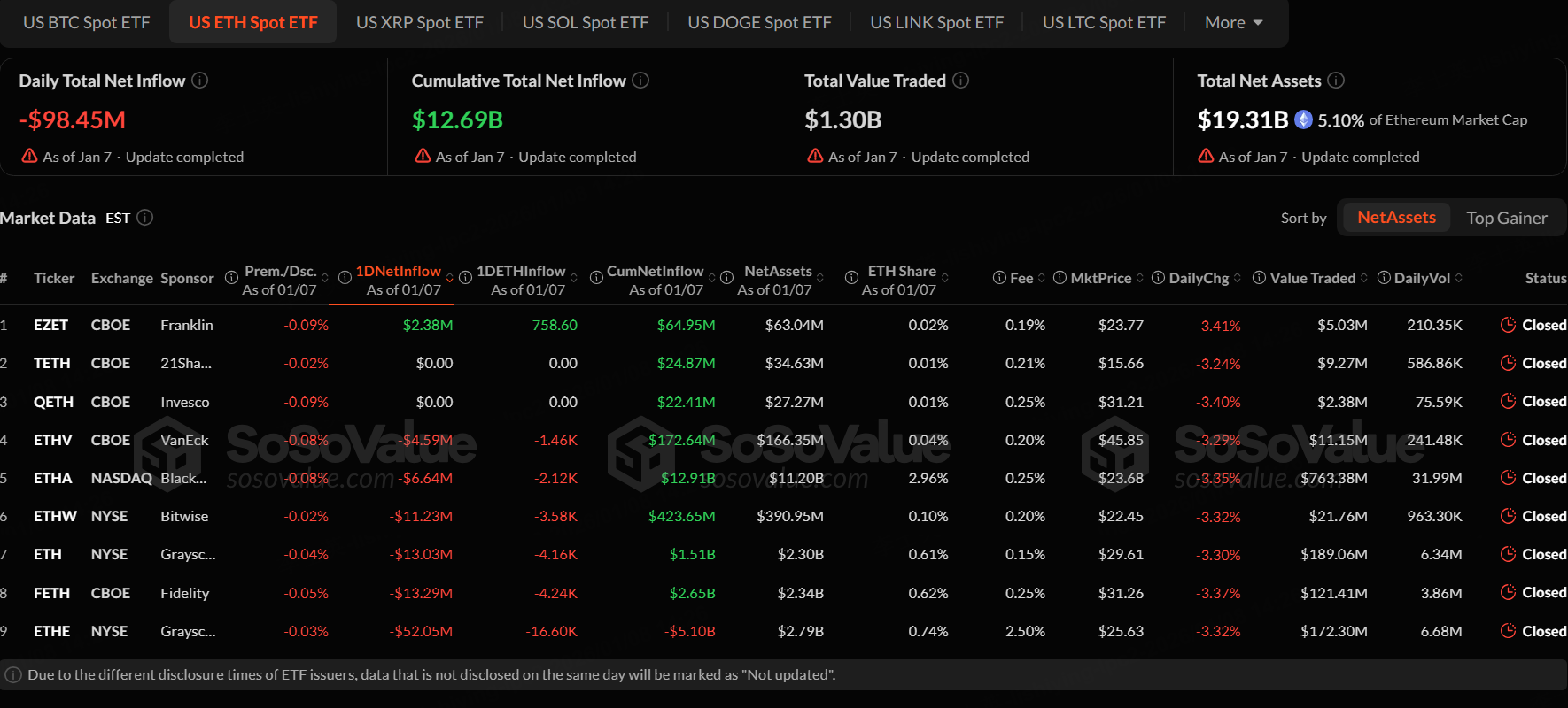 The overall net outflow of the US Ethereum spot ETF on Wednesday was $98.45 million. The total net asset value of Ethereum spot ETFs is $19.31 billion, and the ETF net asset ratio (market value compared to total Ethereum market value) is 5.10%.