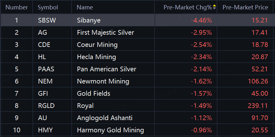 Precious metals shares slid in premarket trading. Sibanye down over 4%; First Majestic Silver down 3%; Coeur Mining, Pan American Silver down over 2%.