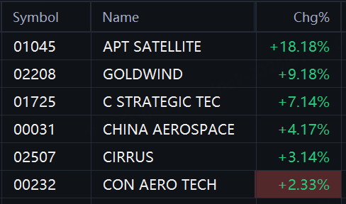 Commercial space stocks jumped in Hong Kong. APT Satellite rose 18%; Goldwind Science rose 9%; China Strategic Technology rose 7%; China Aerospace International rose 4%.