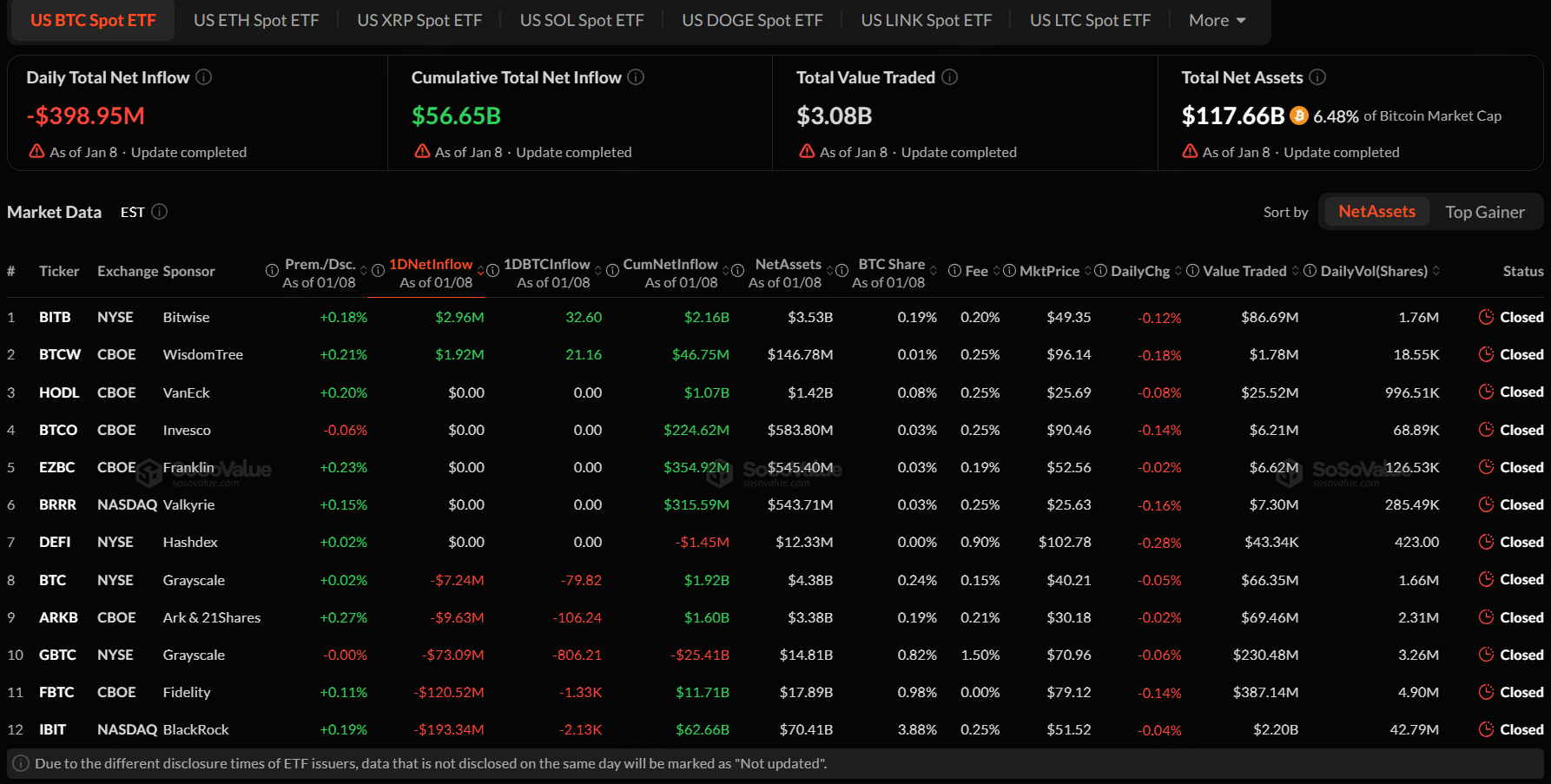 The Bitcoin spot ETF with the highest net inflow on January 8 was Bitwise Bitcoin ETF (BITB), with a net inflow of $2.96 million, according to SoSoValue.
